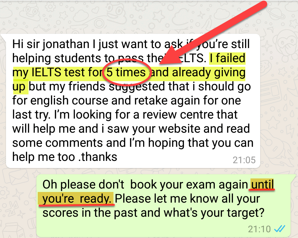 For example, this student messaged me recently and told me she failed her IELTS test 5 times and wanted to give up! But she wanted to give it one last shot.